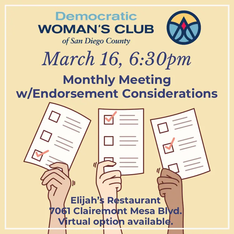Hello ,It’s just one week until our next meeting on Monday, March 16 at 6:30pm, when we will consider the following endorsements:San Diego Unified District BTreasurer, Tax CollectorOceanside City Council D2Superior Court Judge Seat 32AB 1900 Frequently Asked Questions - Medicare For AllPlease note,