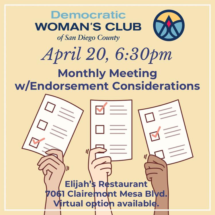Hello ,Join us for our next meeting on Monday, April 20 at 6:30pm. On the agenda is a presentation by Angela de Joseph, founder of Women of Color Roar Media. Don’t miss it!We will also consider the following endorsements:Lemon Grove City Council (3 at large seats)San Diego County Superior Court Judg