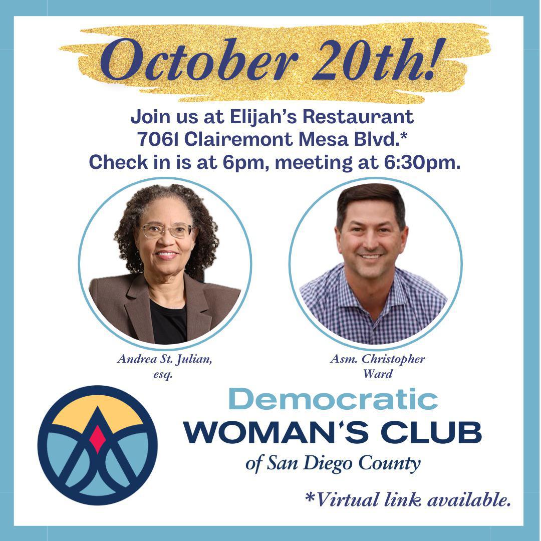 Make plans to attend our October 20th meeting when we’ll hear from Andrea St. Julian on the topic of ranked choice voting. Asm. Chris Ward will also provide updates from Sacramento and answer your Prop 50 questions. In addition, we’ll write postcards to voters! Come at 6pm to order dinner, socialize and build community. The meeting starts at 6:30pm. Elijah’s Restaurant is located at 7061 Clairemont Mesa Blvd. Bring a friend!