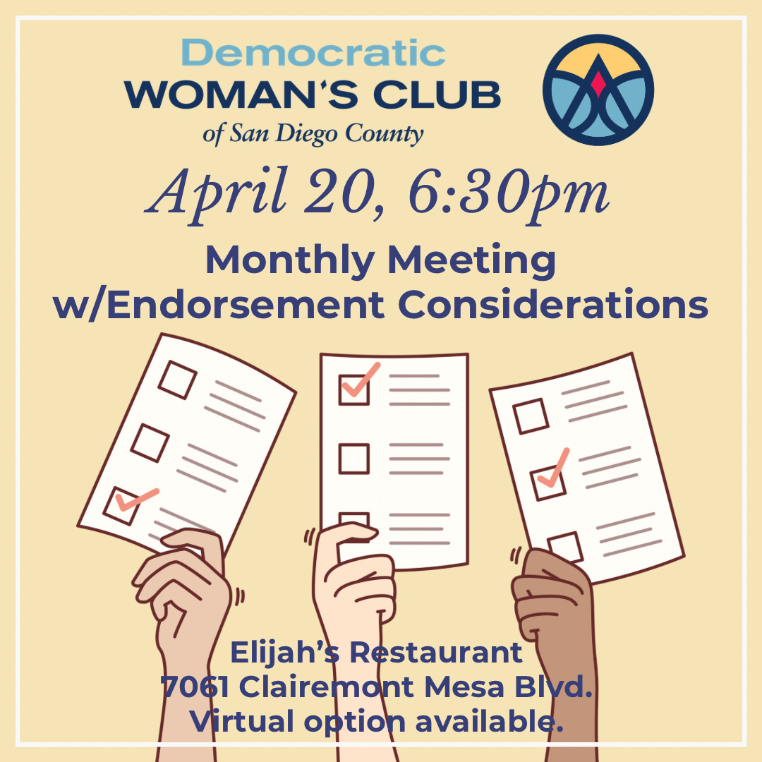 Please note, you must have attended two meetings, as a member, in the last twelve months and be a current member to be eligible to vote on endorsements. All members in good standing are eligible to speak during endorsement consideration discussions. Renew or join here: Membership – Democratic Woman’s Club