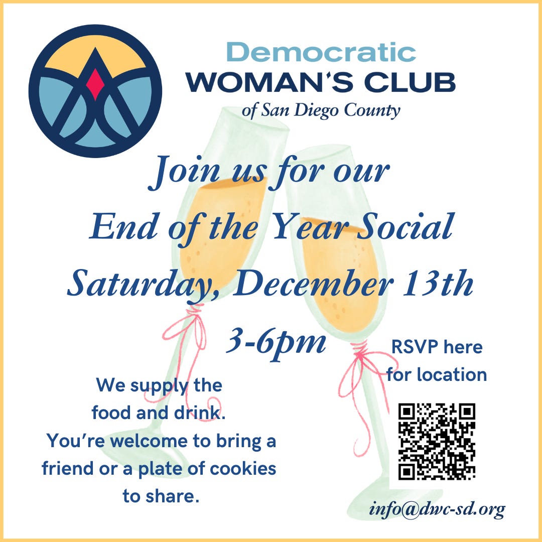 Renew DWC membership for 2026 here https://www.zeffy.com/en-US/ticketing/democratic-womans-club-of-san-diego-county-memberships
